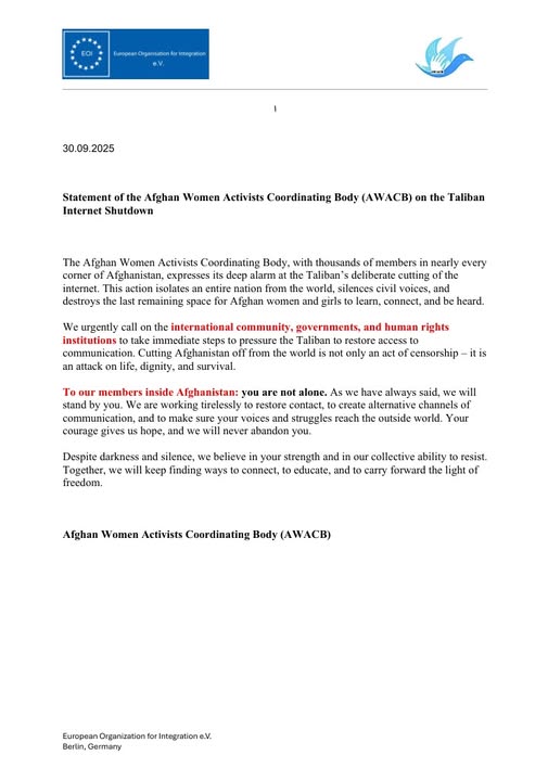 انجمن هماهنگی زنان فعال افغانستان در بیانیهای رسمی، نگرانی عمیق خود را نسبت به قطع عمدی اینترنت توسط طالبان در سراسر کشور ابراز کرده است. این نهاد مدنی که هزاران عضو در گوشهوکنار افغانستان دارد، این اقدام را خاموشکردن صدای میلیونها انسان و نابودی آخرین روزنههای امید برای شهروندان، بهویژه زنان و دختران افغانستان، دانسته است.